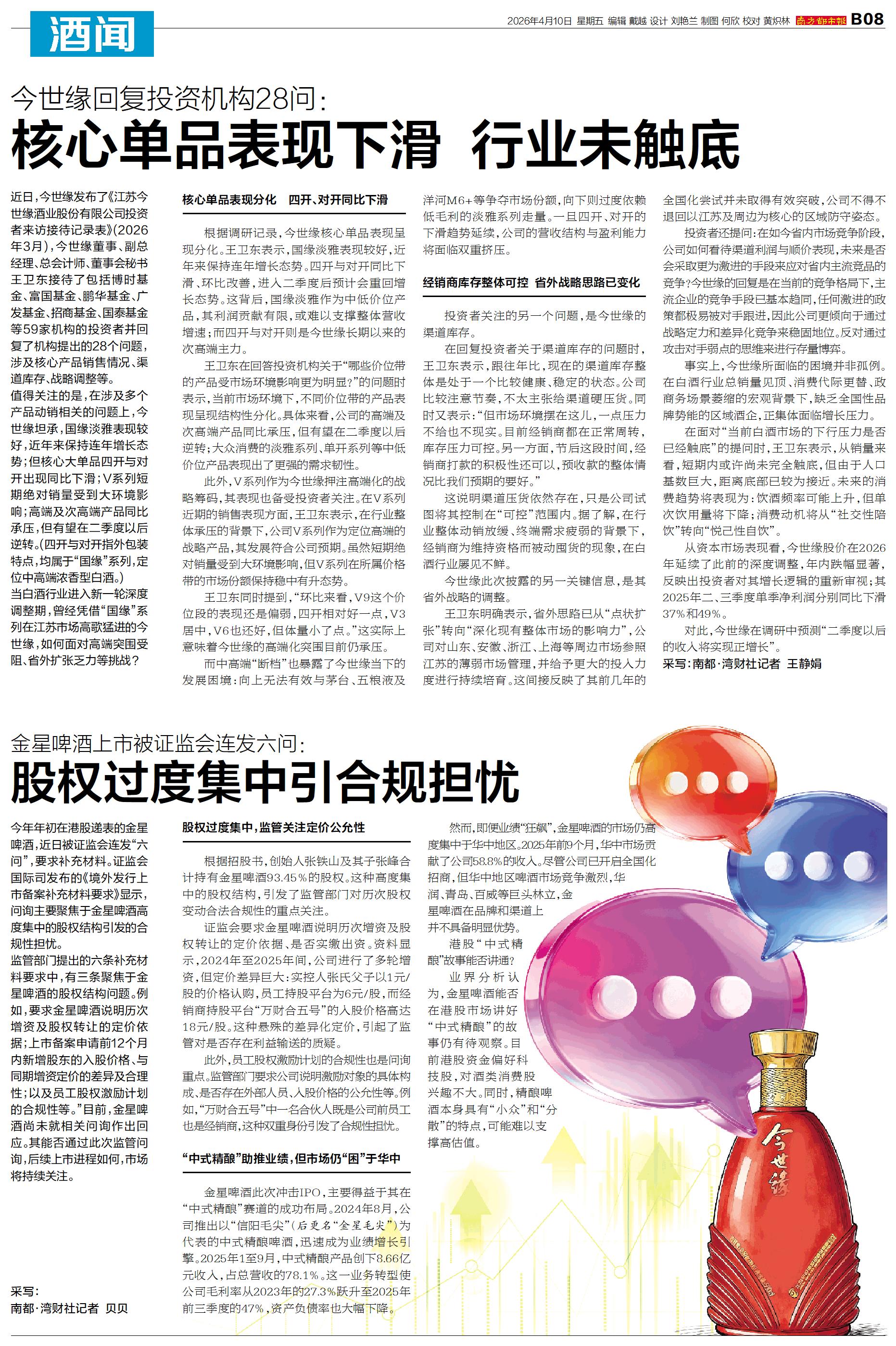 近日,今世缘发布了《江苏今世缘酒业股份有限公司投资者来访接待记录表》(2026年3月),今世缘董事、副总经理、总会计师、董事会秘书王卫东接待了包括博时基金、富国基金、鹏华基金、广发基金、招商基金、