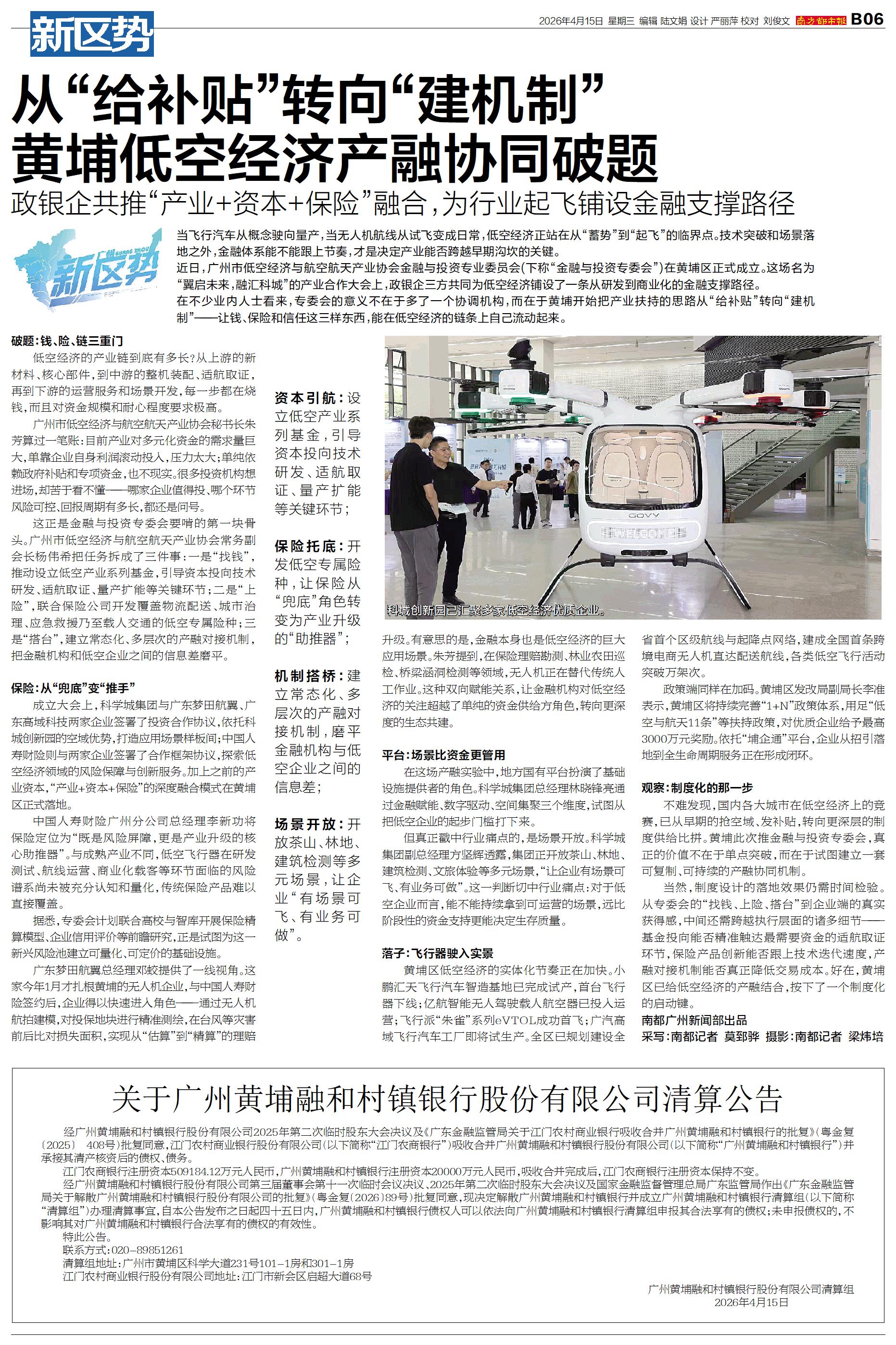 从“给补贴”转向“建机制” 黄埔低空经济产融协同破题