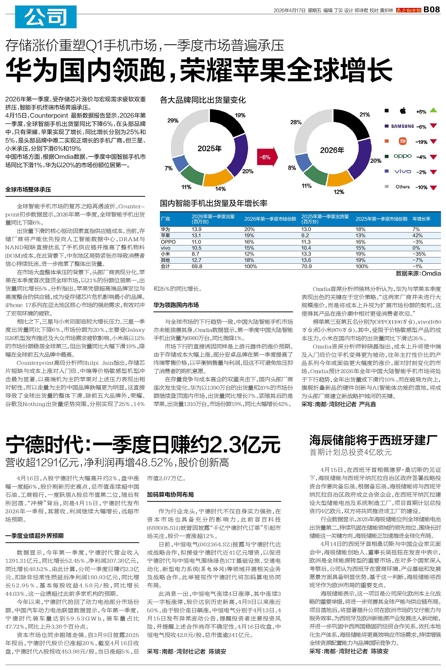 4月16日,A股宁德时代大幅高开约2%,盘中涨幅一度超6%,股价刷新历史高点,总市值连续超中国石油、工商银行,一度跃居A股总市值第二位,随后有所回落。“冲榜”背后,则是4月15日,宁德时代发布2026年一季报,其营收、利润继续大幅增长,远超市场预期。