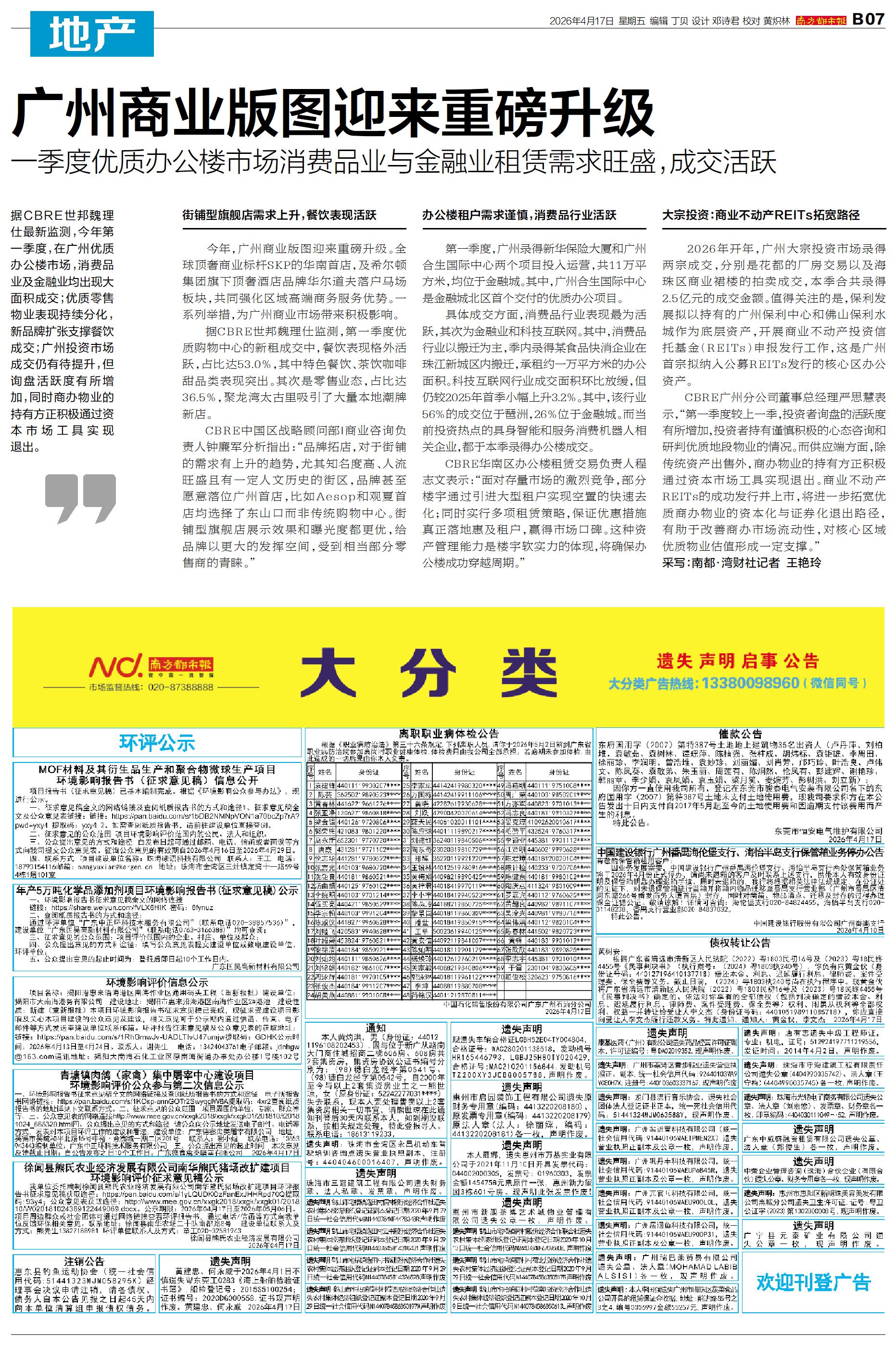 据CBRE世邦魏理仕最新监测,今年第一季度,在广州优质办公楼市场,消费品业及金融业均出现大面积成交;优质零售物业表现持续分化,新品牌扩张支撑餐饮成交;广州投资市场成交仍有待提升,但询盘活跃度有所增