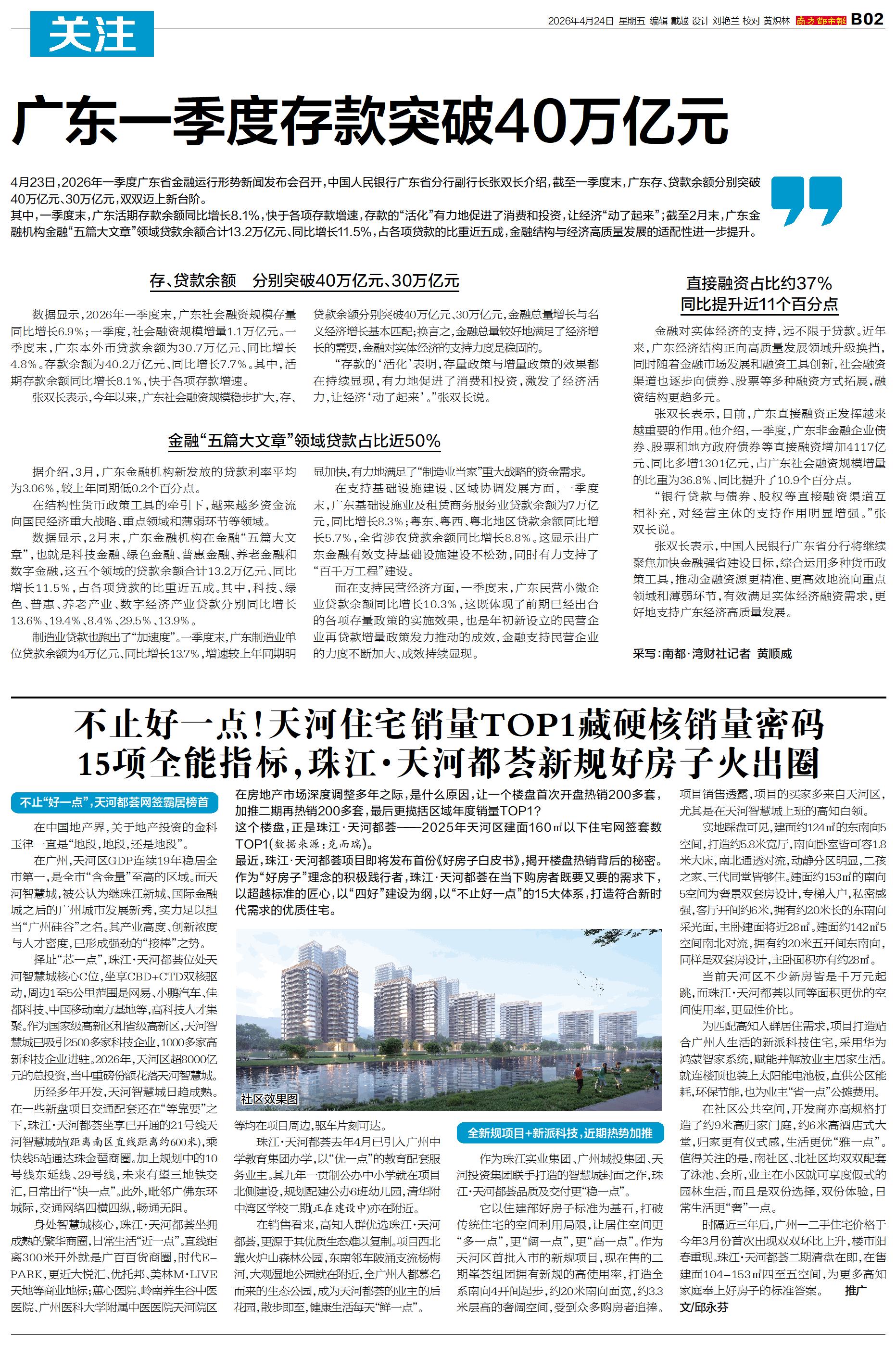 4月23日,2026年一季度广东省金融运行形势新闻发布会召开,中国人民银行广东省分行副行长张双长介绍,截至一季度末,广东存、贷款余额分别突破40万亿元、30万亿元,双双迈上新台阶。 其中,一季度