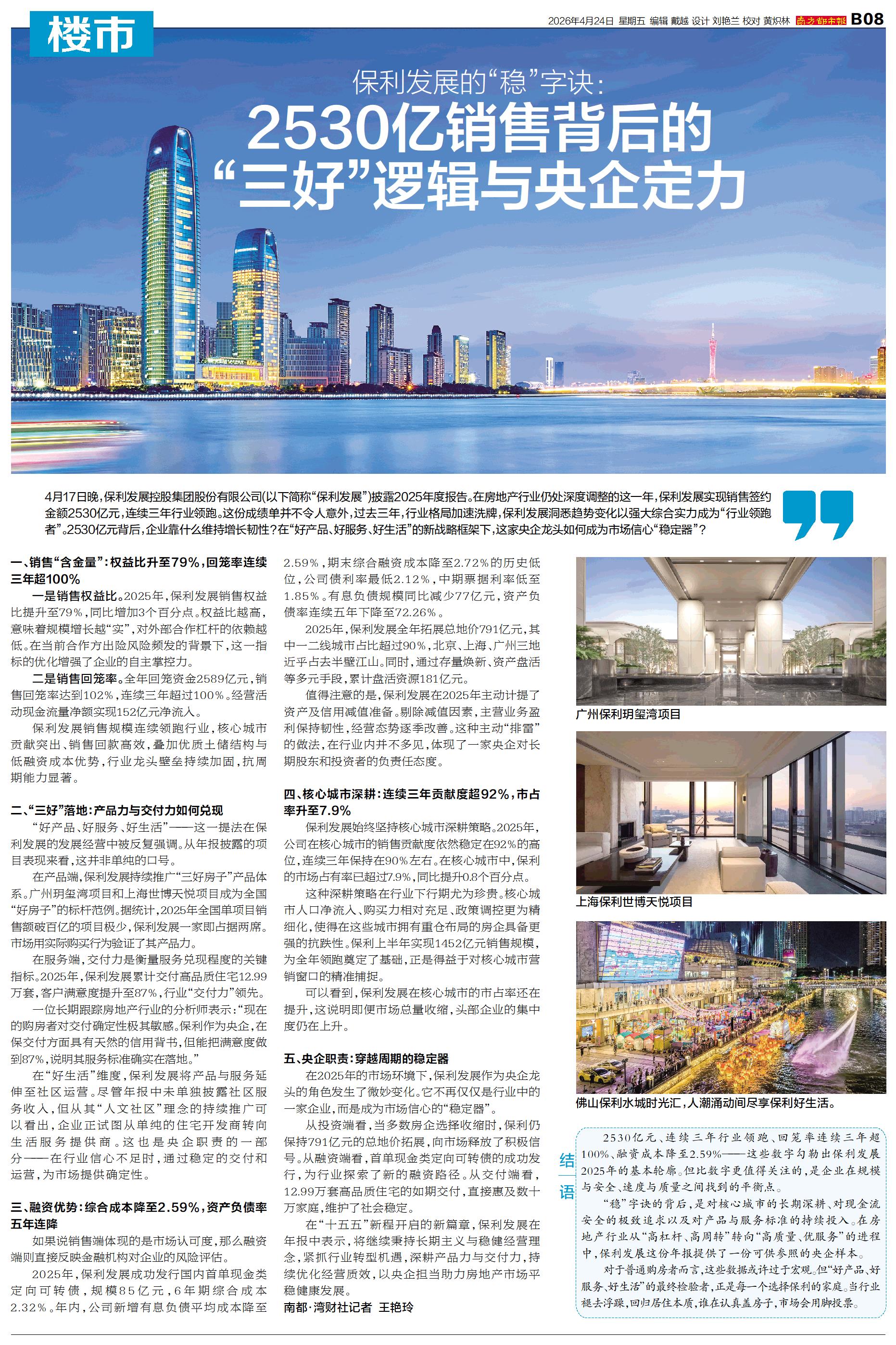 4月17日晚,保利发展控股集团股份有限公司(以下简称“保利发展”)披露2025年度报告。在房地产行业仍处深度调整的这一年,保利发展实现销售签约金额2530亿元,连续三年行业领跑。这份成绩单并不令人