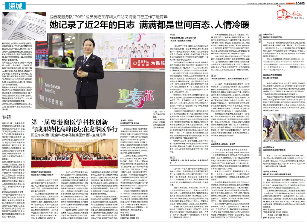 春运期间,在深圳火车站问询窗口,迎春花服务队“70后”成员黄艳坚守着岗位。在这个窗口,她已经工作了近两年。为旅客解疑答惑,连接站内外处理遗失物品,是她工作的主要内容,解决的多是零碎小事,但也是旅客当下
