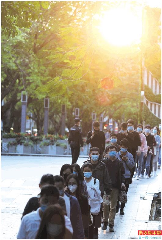 3月10日下午6点半,深圳地铁1号线深大站A3出口外,下班的市民排起长队。深圳地铁实行疫情期间客流管控,由于下班客流较大,人龙排到了科技园文化广场,秩序井然。 南都记者 赵炎雄 摄