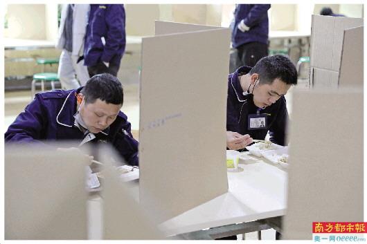 2月10日,深圳市宝安区一电子公司分批复工,员工食堂用硬纸板间隔出一个个单人位置。 宝安通记者 赵炎雄 摄