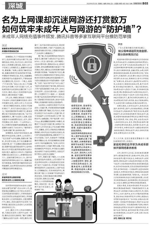 如何筑牢网络游戏未成年人保护体系这堵“防护墙”?南都记者了解到,腾讯、抖音等多家互联网平台采用了多种举措,落实防止未成年人沉迷网络游戏的相关工作。此外,深圳市人大代表、宝安区教育发展事务中心国际教育部负责人张路玉呼吁,学校、家长和社会形成合力,加强未成年人的网络素养,帮助未成年人养成良好的网络行为习惯。