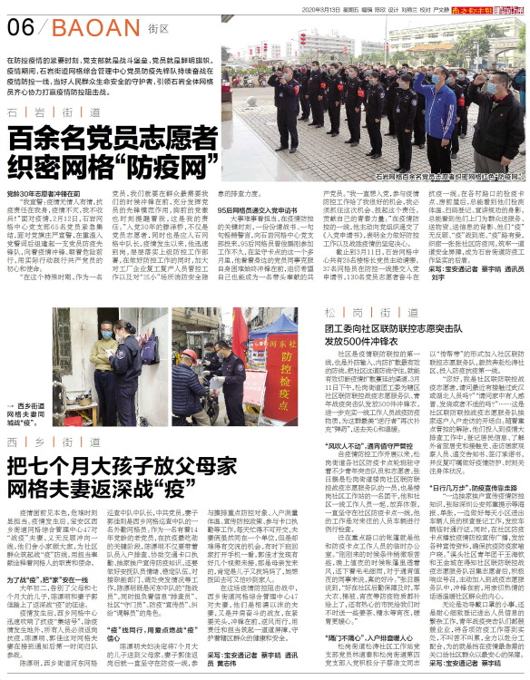 石岩街道在防控疫情的紧要时刻,党支部就是战斗堡垒,党员就是鲜明旗帜。疫情期间,石岩街道网格综合管理中心党员防疫先锋队持续奋战在疫情防控一线,当好人民群众生命安全的守护者,引领石岩全体网格员齐心协力