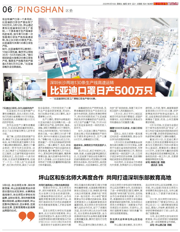 在宣布援产口罩一个多月后,比亚迪的口罩日产量达到了500万只。3月12日,坪山通记者在比亚迪深圳口罩工厂看到,一个原本用于生产高端手机的车间,如今有100条一次性医用口罩生产线在高速运转。加上长沙的3