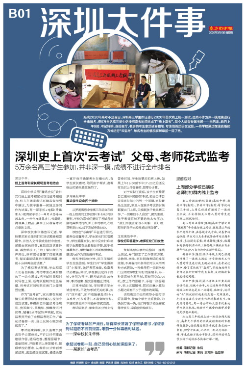 距离2020年高考不足百日,深圳高三学生昨日进行2020年首次线上统一测试。虽然不作为深一模成绩进行全市排名,但5万余名高三学生仍按照高考时间完成了“线上高考”。每个人都有专属考场——自己家。昨日上午