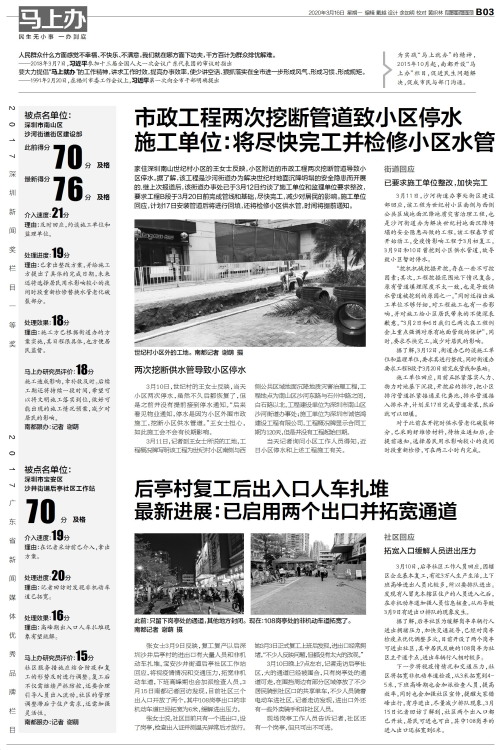 家住深圳南山世纪村小区的王女士反映,小区附近的市政工程两次挖断管道导致小区停水。据了解,该工程是沙河街道办为解决世纪村地面沉降坍塌的安全隐患而开展的.继上次报道后,该街道办事处已于3月12日约谈了施工