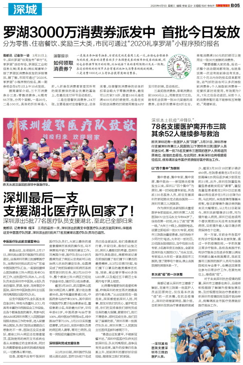 昨天深圳还有一批医护人员“回家”。3月31日,深圳市举行支援深圳市第三人民医院(以下简称市三院)医护人员欢送仪式,第一批78名支援市三医院的医护人员将返回原岗位,继续抗击疫情。与此同时,未来深圳也将根