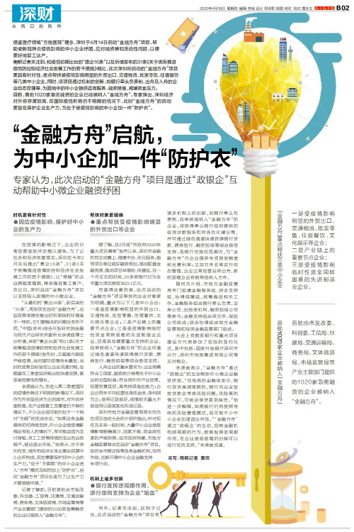 借鉴医疗领域“方舱医院”理念,深圳于4月14日启动“金融方舟”项目,帮助受新冠肺炎疫情影响的中小企业纾困,应对融资难和流动性问题,以便更好地复工达产。南都记者关注到,和疫情初期出台的“惠企16条”以及