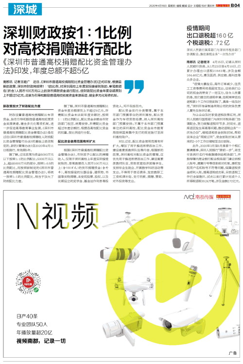 南都讯 记者王睦广 近日,《深圳市普通高校捐赠配比资金管理办法》正式印发,根据最新的政策,深圳市财政将按照1∶1的比例,对深圳高校上年度实际接受到账的、单笔数额在(折合)人民币100万元以上的货币捐赠
