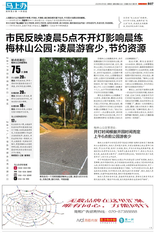 在梅林山公园晨练多年,多次因晨间路灯开灯时间投诉公园。深圳市民蒋先生告诉记者,近日,梅林山公园上午5点到6点之间不开灯,对该时段的晨练市民造成困扰,多次打电话投诉,公园都不调整开灯时间。对此,公园管理