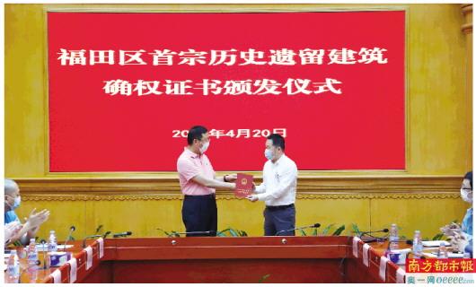 为表扬下梅林实业股份有限公司取得首宗历史遗留建筑确权证书,鼓励各街道对标先行先试,大力推进福田区历史遗留建筑确权工作,会上,福田区委常委刘柏廷为福田区首宗确权历史遗留建筑产权方下梅林实业股份有限公司颁发了《中华人民共和国不动产权证明书》。此次证书颁发,标志着福田区农村城市化历史遗留违法建筑处理确权工作实现了新的突破,将进一步为福田区盘活现有有限空间,释放更多经济发展动能奠定空间基础。刘柏廷指出,福田作为深圳中心城区和深港科技创新合作区所在地,要在查违方面做到先行示范,打造全市查违工作标杆,做好查违工作的标兵和尖兵。