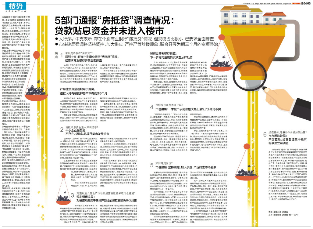 未发现刚注册企业即申请经营贷、支小再贷款信贷资金通过“房抵贷”形式流入楼市、不存在网传贷款贴息资金进入房市的情形……4月22日,深圳住建局、市市场监管局、人行深圳中心支行、市银保监局、市中小企业服务局
