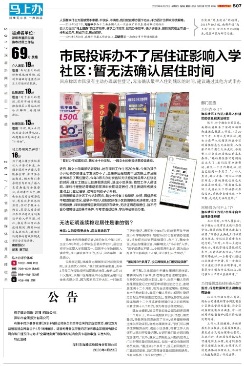 近日,魏女士向南都记者反映,她在深圳工作生活20余年,今年为孩子小升初去办居住证才发现办不了。直接原因是她去年因为换工作及搬家而疏忽了居住登记,今年3月去办时被告知无法查证她最早入住辖区的时间。魏女士