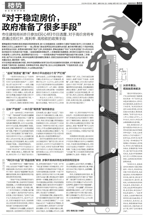 某捂盘惜售开发商所有在深销售项目网签暂停,数十亿货值遭锁定;光明某中介通知下架单价高于6.3万元房源;贝壳单价20万以上房源齐齐下架……继上周5部门联合发声回应深圳近期热点问题,表示将开展为期三个月的市场乱象专项整治行动后,本周深圳楼市频传“亮剑”之声。坊间传闻中,更有此前房价“热炒”片区多主管部门于4月28日开始对辖区中介机构进行线下检查,一经发现违规即顶格处罚,二手房指导价酝酿推进,深圳官方已组织中介协会、业内专家等人士多次开会,就政策细节进行讨论……一时间有关房地产市场整顿严查的消息不断从新房、二手房市场、地产中介行业传来。深圳市住建局方面向南都记者表示,目前已经启动针房地产市场专项整治行动,相关查处情况,届时将统一发布。