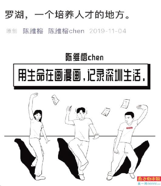在他的公号中,描述罗湖的笔墨甚多。《罗湖,一个培养人才的地方》《罗湖人:故事每天在这里发生》等推文写罗湖学校、罗湖美食、罗湖娱乐……每一篇推文都引起粉丝共鸣:有“老罗湖”在文末留言“为啥你每篇文章都是那么有回忆的呢!”“这真是一个暴露年龄的公众号”,也有“新人”表示默默记下美食、安排慢慢吃。谈及一贯以来坚持记录罗湖的初衷,他说:“想要画出好的作品,想说好每一个故事,想成为这样的人。”