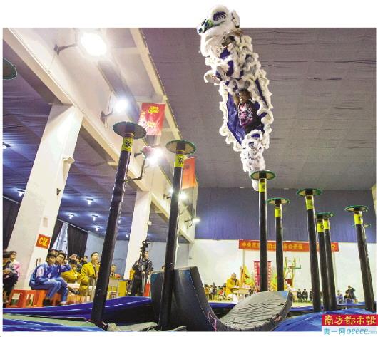 玉律醒狮队表演绝活“翻山越岭采灵芝”。 玉塘街道供图