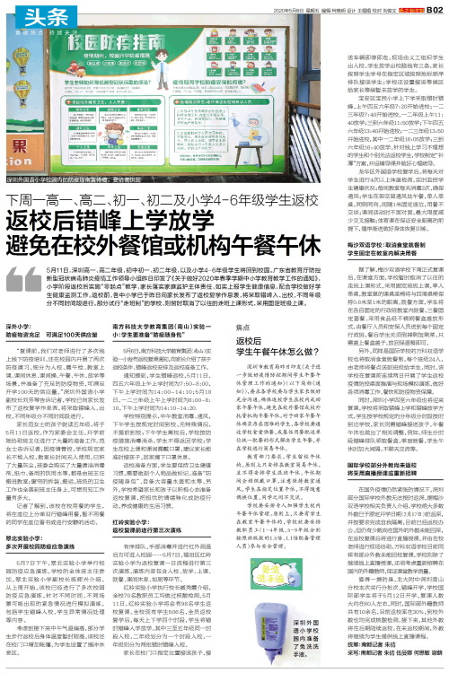 5月11日,深圳高一、高二年级,初中初一、初二年级,以及小学4-6年级学生将回到校园。广东省教育厅防控新型冠状病毒肺炎疫情工作领导小组昨日印发了《关于做好2020年春季学期中小学教育教学工作的通知》,