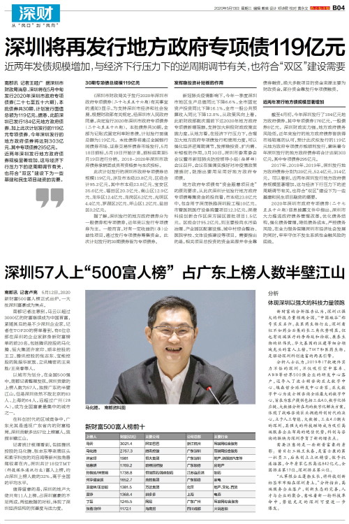 南都讯 记者卢亮 5月12日,2020新财富500富人榜正式出炉,一大批深圳富豪成为焦点。南都记者注意到,马云以超过3000亿的财富继续成为中国首富,紧随其后的是不少深圳企业家。记者在TOP20的榜单