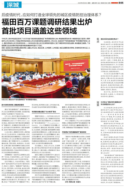 今年2月,深圳市福田区发布了100万元的“建设韧性健康城区”专项课题招标公告,希望借助更加科学、有前瞻性的力量深入调研城市公共卫生体系,打造全球领先的城区公共卫生疫情防控治理体系。5月22日,福田召开