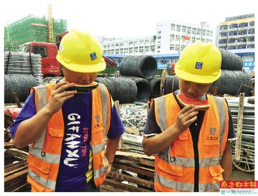 关爱活动给工地上的建设者们送去西瓜。 冯丹 摄
