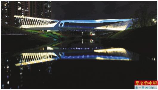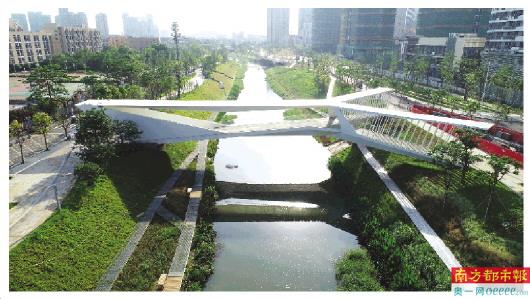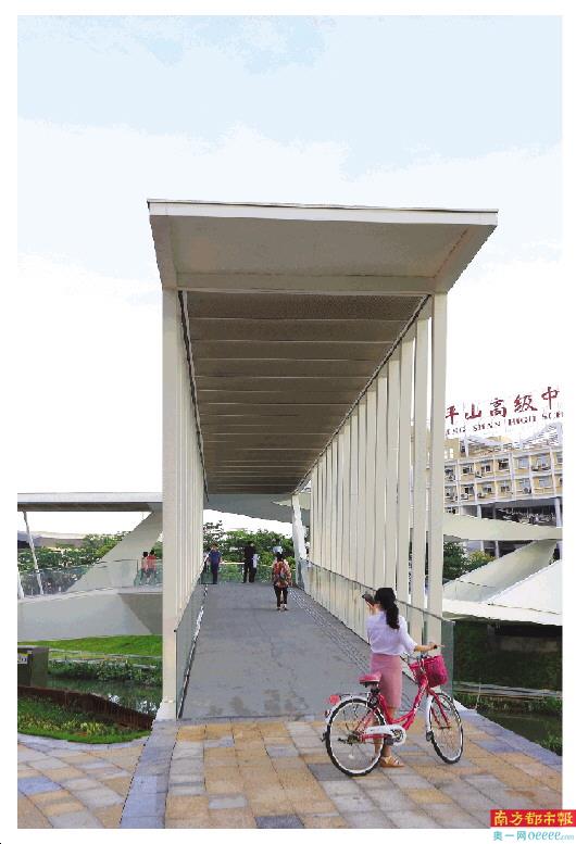 连接坪山高级中学与世贸建筑地块的人行景观桥建成,坪山河上又增加了一道风景线。