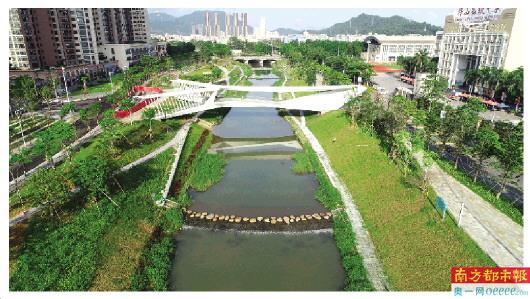 坪山河干流人行景观桥结合水环境全新设计理念,两岸配备庆典草坪、景观喷泉石雕、观赏性乔灌木花卉、过河汀步、运动亲子公园等设施,不仅保证两岸市民、学生的顺利通行,又为坪山市民提供了一个极具观赏性的休闲娱乐活动场地。