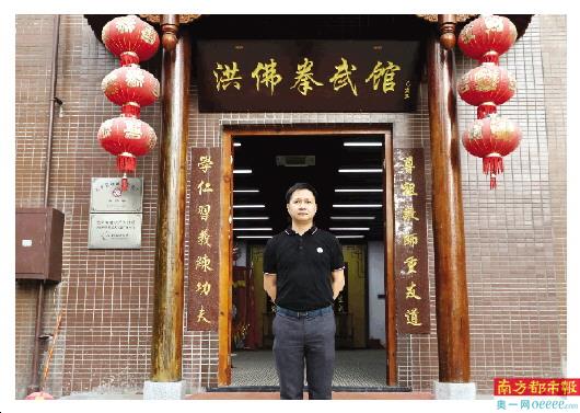 洪佛拳第九代主要传承人洪榜开站在洪佛拳武馆前。