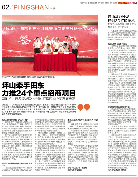 6月3日下午,广西田东县招商推介会在坪山召开,重点推介了田东县“八园一镇”一共24个特优招商引资重点项目,并举行了系列签约,包括《坪山区—田东县产业共建暨协同招商战略合作协议》签约,田东县与华润电力投