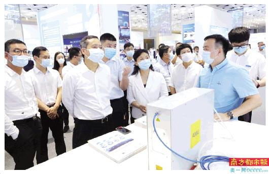 区委书记姚任、区长郭子平在与现场展演的企业交流。 南都记者 顾威 摄