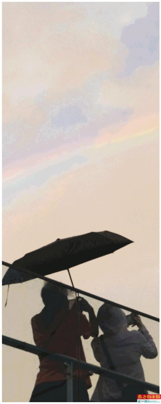昨日,深圳笋岗西路附近,市民用手机拍摄雨后的彩虹。