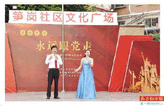 为庆祝中国共产党建党99周年,高歌赞颂党与人民齐心抗疫,共克时艰,6月29日下午,笋岗街道笋岗社区文化广场热烈开展“永远跟党走”文艺演出活动,演出团队通过小组唱、对唱、独唱等方式,歌舞结合,为居民群众带来了国家大剧院抗击疫情主题原创作品混声小合唱《天使的身影》、广场舞《再唱山歌给党听》、伞舞《祖国的好江南》、男声独唱《祖国慈祥的母亲》、秧歌《把咱的秧歌扭起来》等十余个表演,吸引了上百位居民群众观演。