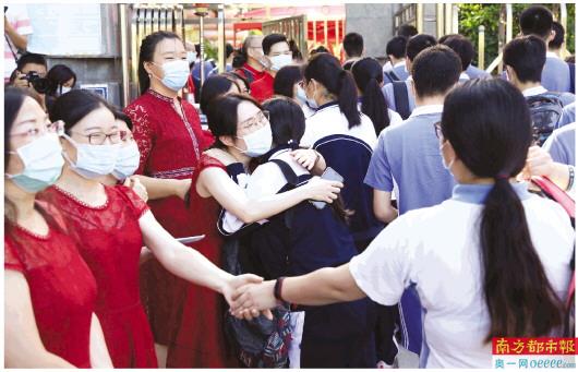 深圳福田中学,2020高考开考前,老师们与学生一一拥抱。南都记者 顾威 摄