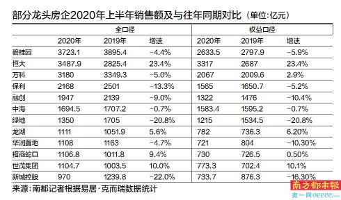 并非所有的龙头房企都可以幸免于这次“黑天鹅”,南都记者统计数个龙头房企销售成绩来看,上半年的疫情冲击,龙头房企的销售额之间分化明显。譬如绿地、新城两家销售额同比去年出现较大程度萎缩,降额均在两成以上;而个别如恒大、世茂等不降反增,增速破10%。