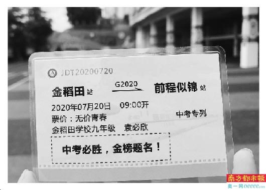 中考首日进考场,金稻田学校的每一位考生都收到了一张特殊的“高铁票”。这张出发站为金稻田学校站,目的地是“前程似锦”站的G2020次高铁票,是该校初三全体老师们为中考的学生们精心制备的。这张“中考专列”高铁票,出发时间正是中考首日语文科目正式考试时间9:00,票价为“无价青春”。