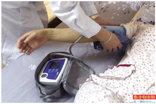 深圳市人民医院宁养院医护人员来到龙岗的一个城中村,为一位居家的乳腺癌晚期病人提供服务。 图为病人正在测量血压。 南方日报记者 朱洪波 摄