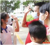 深圳实验学校初中部考场门前,一家人来为姐姐加油。 受疫情影响,广东省原定于6月举行的2020年初中学业水平考试延迟举行。按照相关部署,深圳中考文化课考试延迟至7月20日、21日