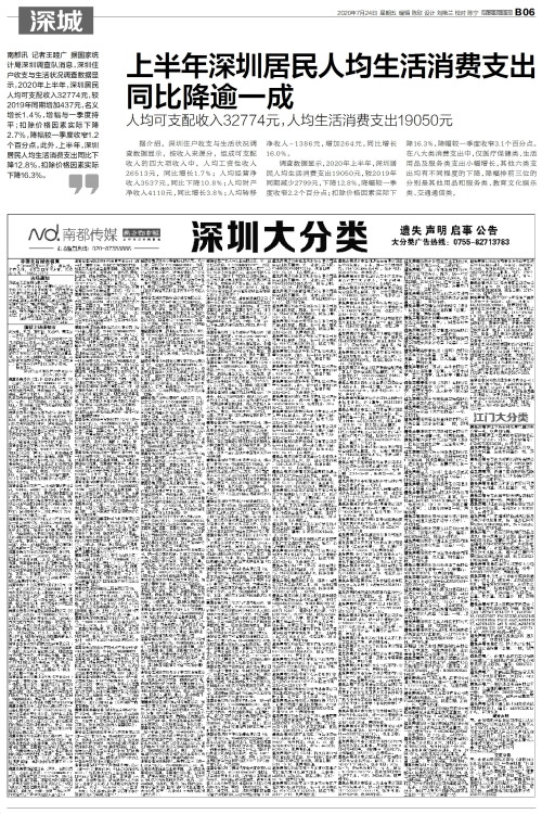 南都讯 记者王睦广 据国家统计局深圳调查队消息,深圳住户收支与生活状况调查数据显示,2020年上半年,深圳居民人均可支配收入32774元,较2019年同期增加437元,名义增长1.4%,增幅与一季度持