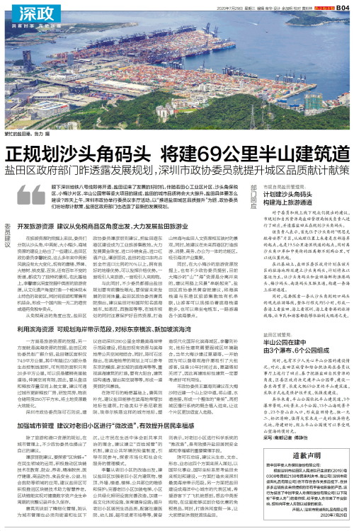 眼下深圳地铁八号线即将开通,盐田迎来了发展的好时机,伴随着田心工业区片区、沙头角保税区、小梅沙片区、半山公园带等重大项目的建成,盐田的城市品质将会大大提升。盐田具体要怎么建设?昨天上午,深圳市政协举行
