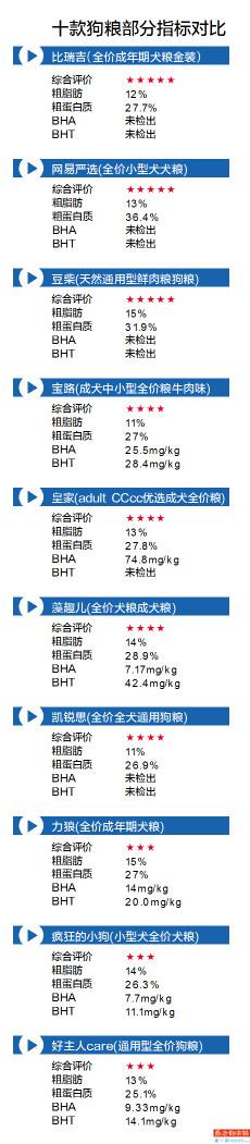 据介绍,本次比较试验从线上渠道采购了10款热销狗粮进行测试,依据相关的国家规范性文件以及标准要求及商品明示数据等。并且采取“更多,更严”标准,多项指标参照国外的标准法规等,如钙磷比参考AAFCO(美国饲料管理协会)推荐值1:1-2:1,BHA、BHT参考日本宠物食品法:乙氧基喹啉、BHA、BHT之和<150mg/kg。