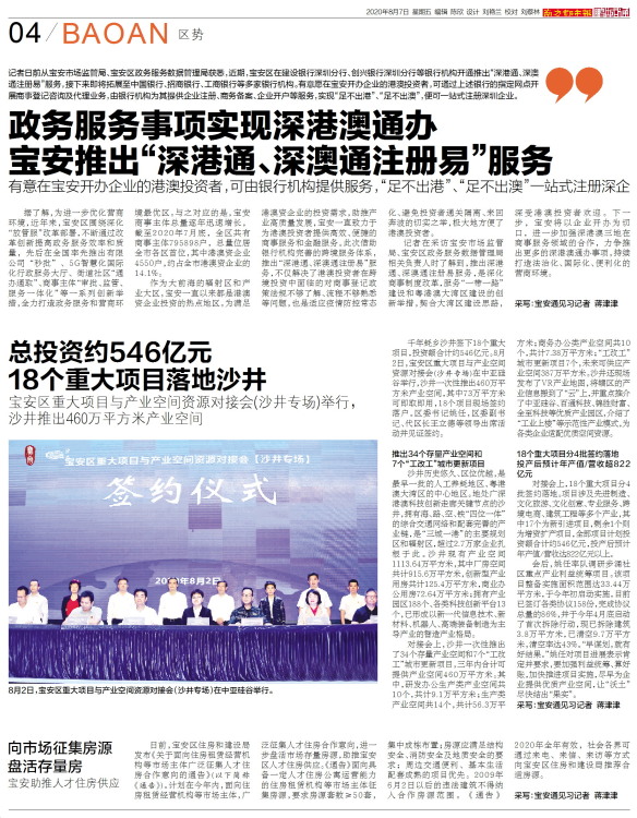 千年蚝乡沙井签下18个重大项目,投资额合计约546亿元。8月2日,宝安区重大项目与产业空间资源对接会(沙井专场)在中亚硅谷举行,沙井一次性推出460万平方米产业空间,其中73万平方米可即取即用,18个