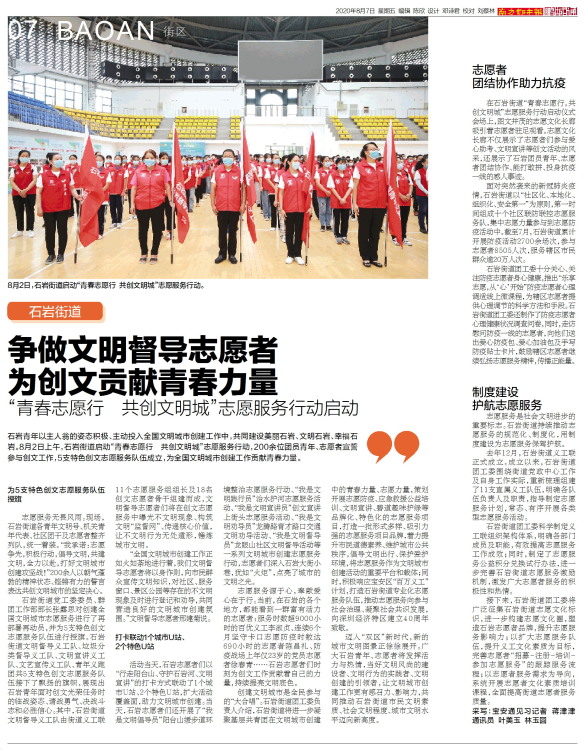 石岩街道石岩青年以主人翁的姿态积极、主动投入全国文明城市创建工作中,共同建设美丽石岩、文明石岩、幸福石岩。8月2日上午,石岩街道启动“青春志愿行 共创文明城”志愿服务行动,200余位团员青年、志愿