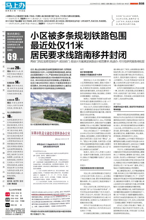近日,南山区桃源街道龙辉花园居民反馈称,在西丽高铁枢纽建设计划中,小区将被多条铁路线包围,其中最近处距居民楼仅11.7m,严重影响他们的生活环境,居民要求南侧的高铁线路设计整体南移并作封闭处理。对此,
