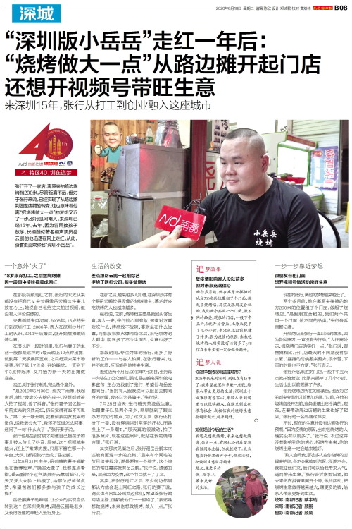 张行开了一家店,离原来的路边烧烤档200米。尽管距离不远,但对于张行来说,已经实现了从路边摊到固定店铺的转变,这也意味着他离“把烧烤做大一点”的梦想又近了一步。张行是河南人,来深圳已经15年。去年,因为冒雨接孩子放学,长相酷似著名相声演员岳云鹏的他迅速在网上走红。从此,食客更喜欢称他“深圳小岳岳”。