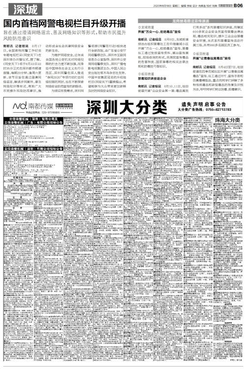 南都讯 记者程昆 8月17日,全国首档网警工作纪实专题电视栏目《网安天下》在深圳举办开播仪式。据了解,《网安天下》将于8月22日22时35分正式在深圳都市频道首播,每期20分钟,逢周六更新。该节目旨在