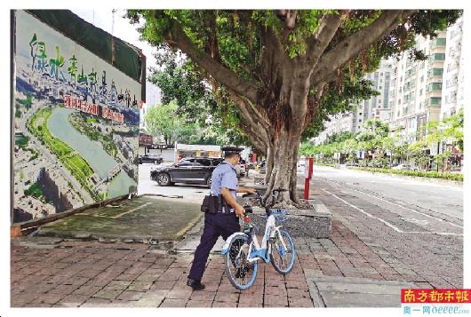 燕罗街道工作人员将共享单车、电单车摆放整齐。