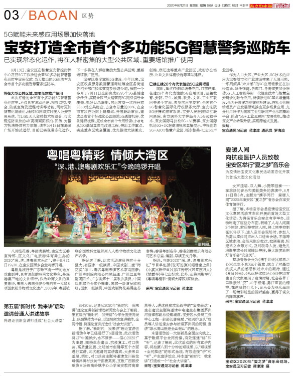 8月13日,宝安区在智慧宝安管控指挥中心召开5G工作推进会暨5G多功能智慧警务巡防车启用仪式。当天推出的5G巡防车为全市首个多功能智慧警务巡防车。将在大型公共区域、重要场馆推广使用此次打造的全市首个多